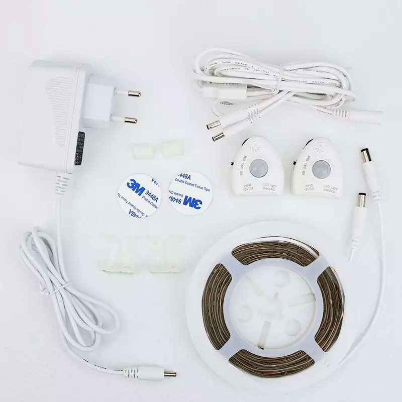 1. 12V Power Adapter 1 pcs 2. Body induction And Light induction Sensor 1 pcs 3. 1.2m LED Strip 1 pcs |