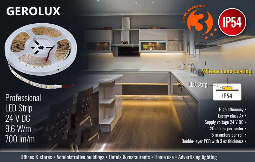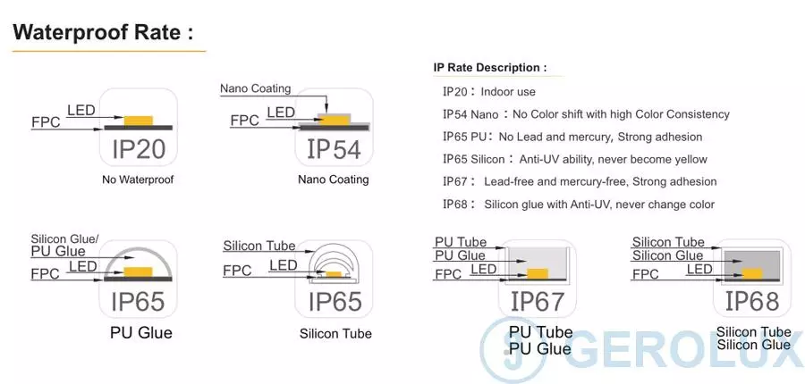 As a 10-year experienced LED strip manufacturer with BSCI certification and products certified by CE, RoHS, TUV, and UL , GEROLUX provides high-quality lighting solutions for various applications. Among our extensive product lineup, IP20 non-waterproof (bare PCB) LED strips and IP54 nano-coated waterproof LED strips are two popular choices.